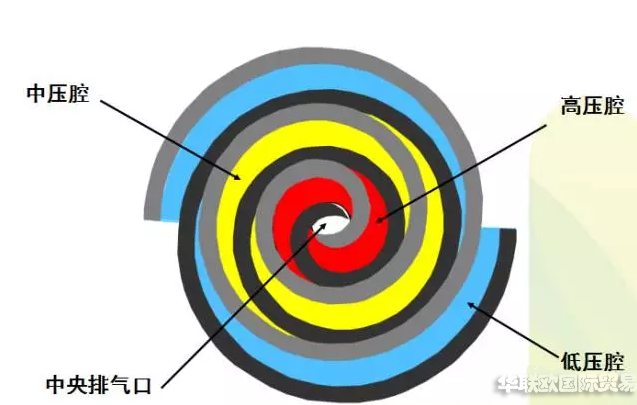 連續(xù)不斷的吸、排氣;渦盤左右兩側(cè)同時進行壓縮。